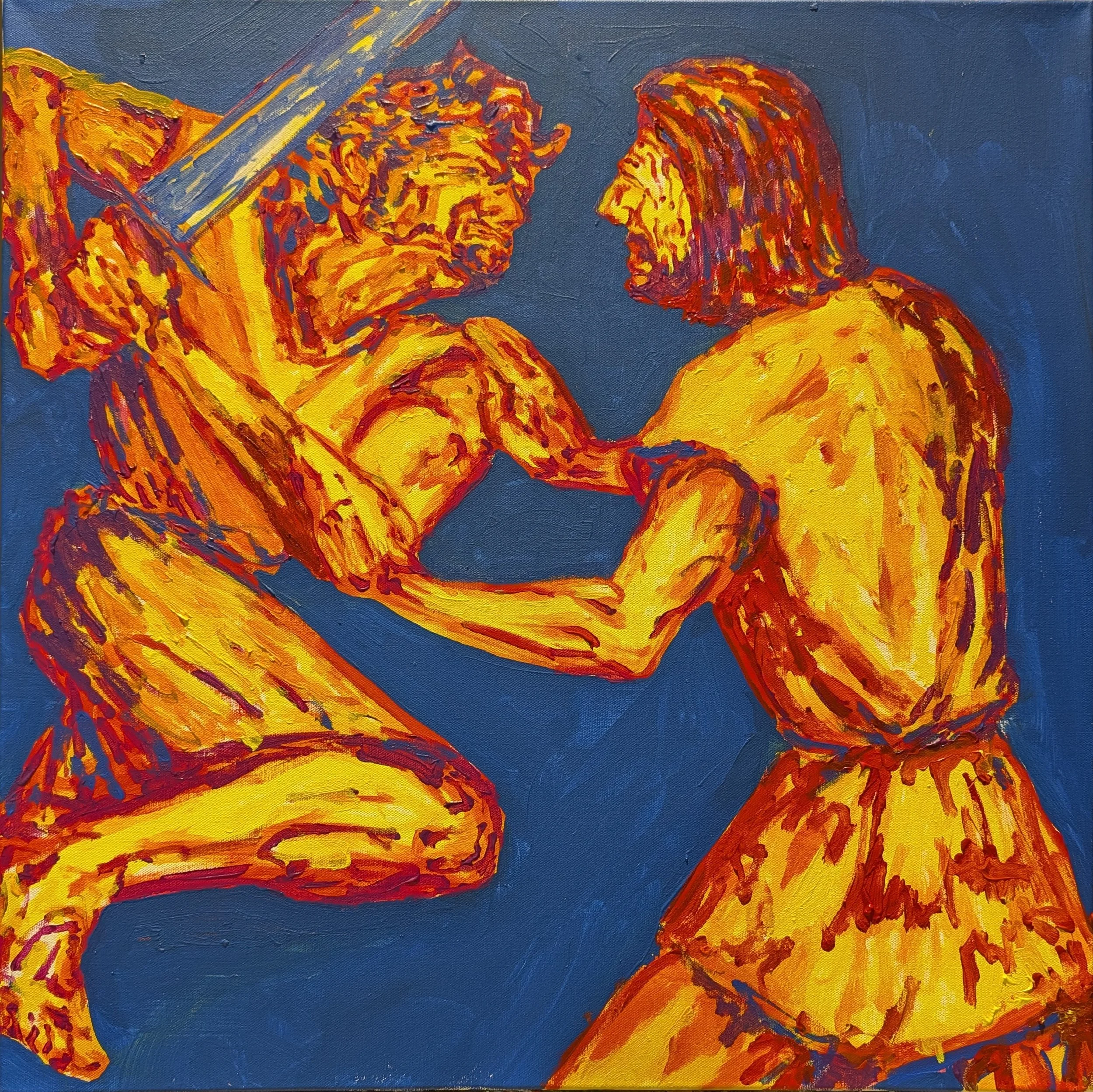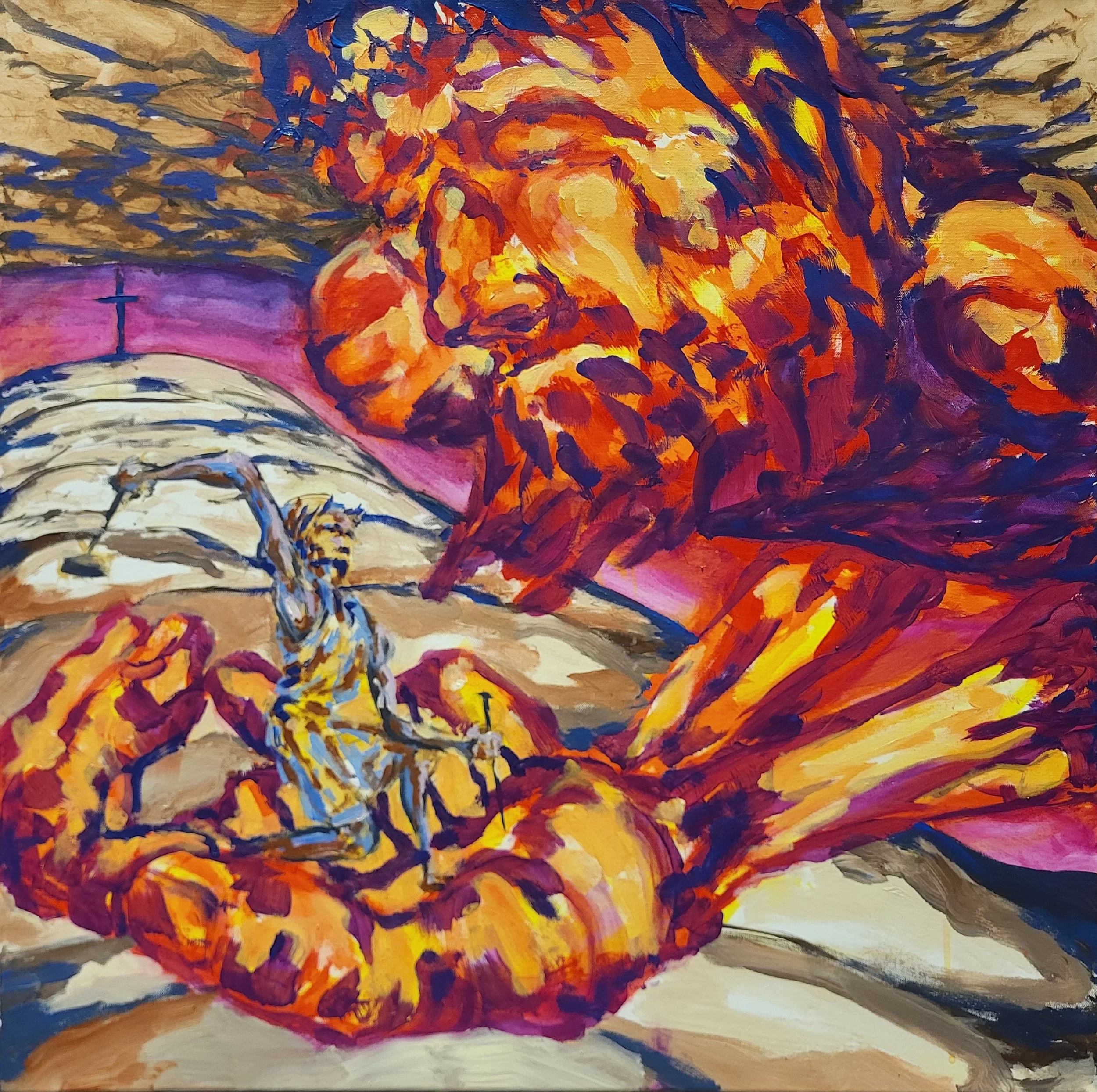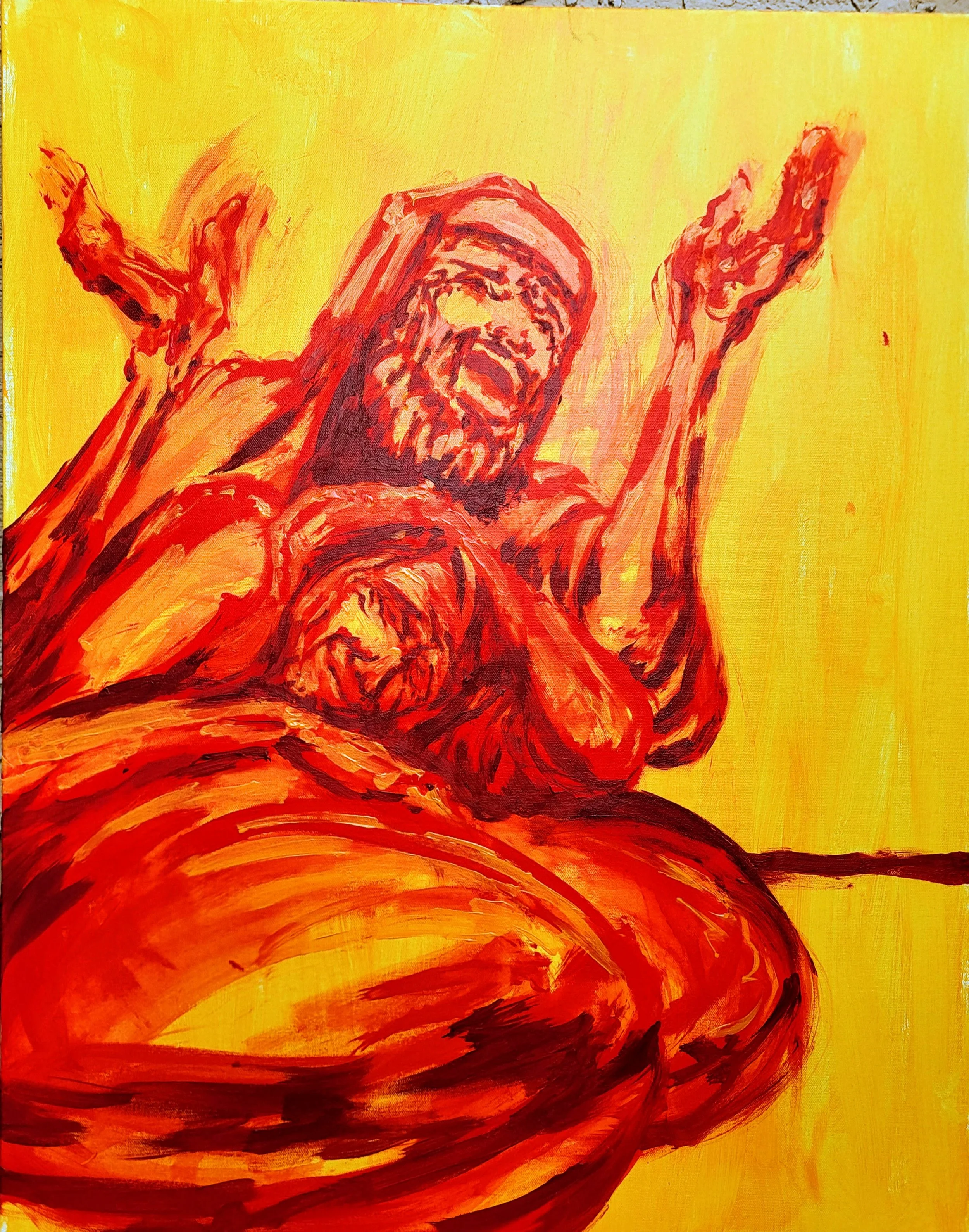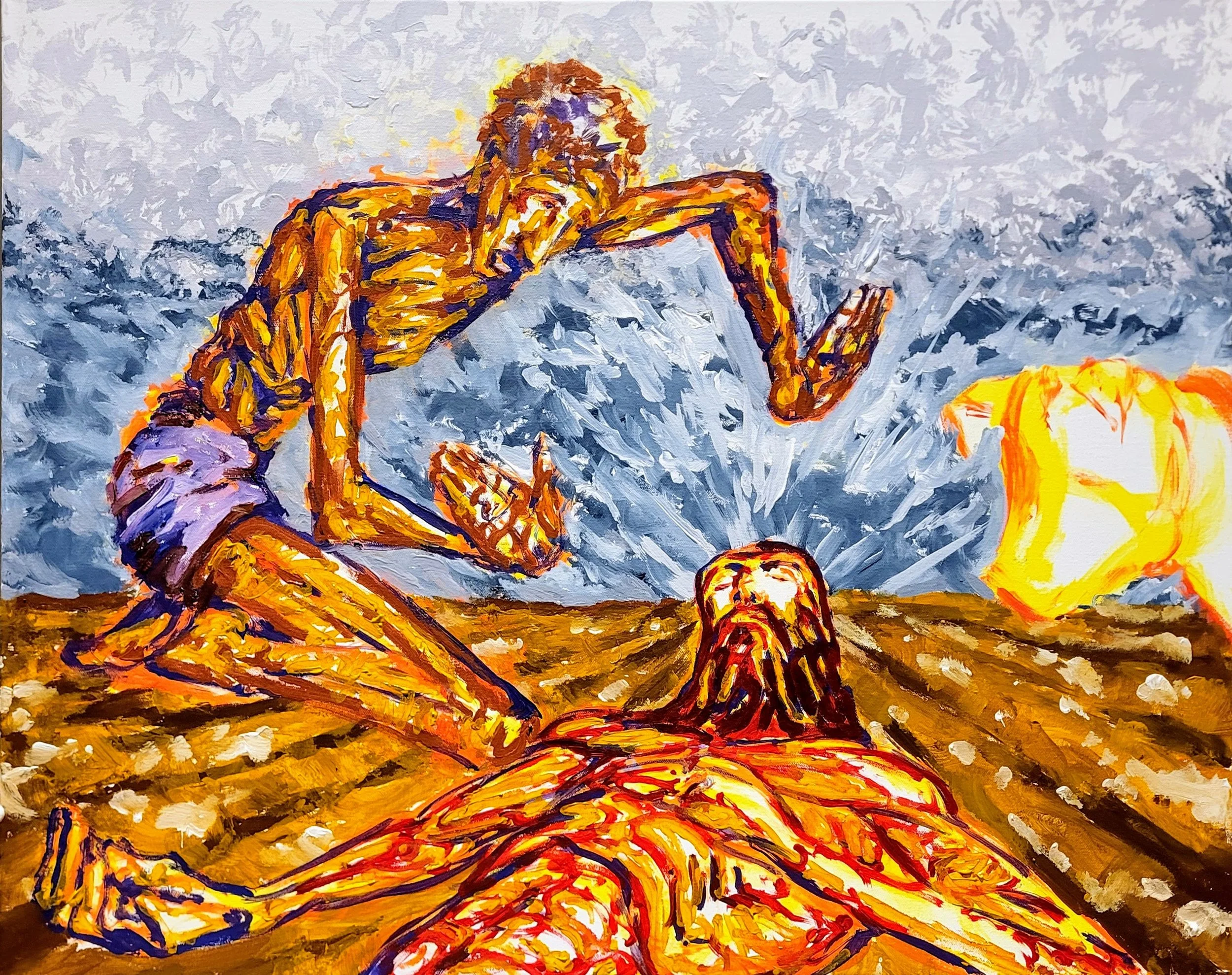 I came to Hope Covenant on this Sunday with no vision for the painting and for 20-30 minutes stood in front of the canvas waiting (How fitting that ‘certainty vs. doubt’ was the theme!) Then, while co-leading the song service, Brandon said, “Jesus is the cornerstone on whom we trust and build our life.” Shortly afterward, Doug showed slides of the Australian coast to highlight the co-leader of the song service, Amy, who happened to be home on break from her missionary training program in Australia. So, I got an image of a bright coastline with fortress-like rocks. Then, I flashed back to my childhood in Alaska; I would look on in wonder at my dad walking across log beams high off the ground, swinging sledge hammers and lifting walls to build house after house. So, look closely and you'll see my dad and I walking those beams together.
