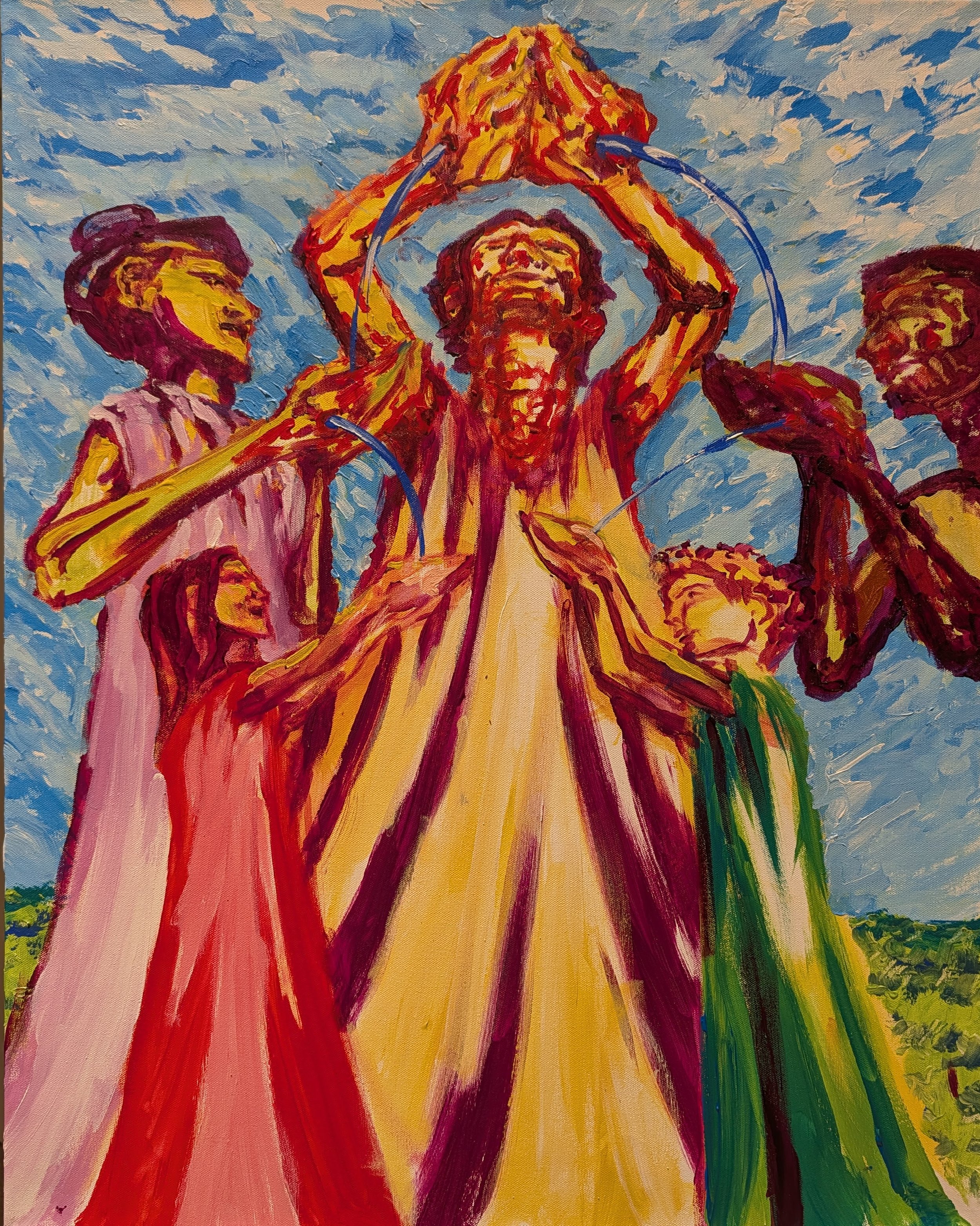 The night before Easter, I meditate on the discovery of the empty tomb (Luke 24:1-12). I get an image of Jesus offering the Water of Life—his very Spirit—as it pours through the holes in his hands, left by the nails of the cross. The rest of the composition remains vague. But, on Easter morning, as I see families doing Easter egg hunts, laughing and serving one another, I get inspired to paint a family surrounding Jesus, receiving Him in awe.